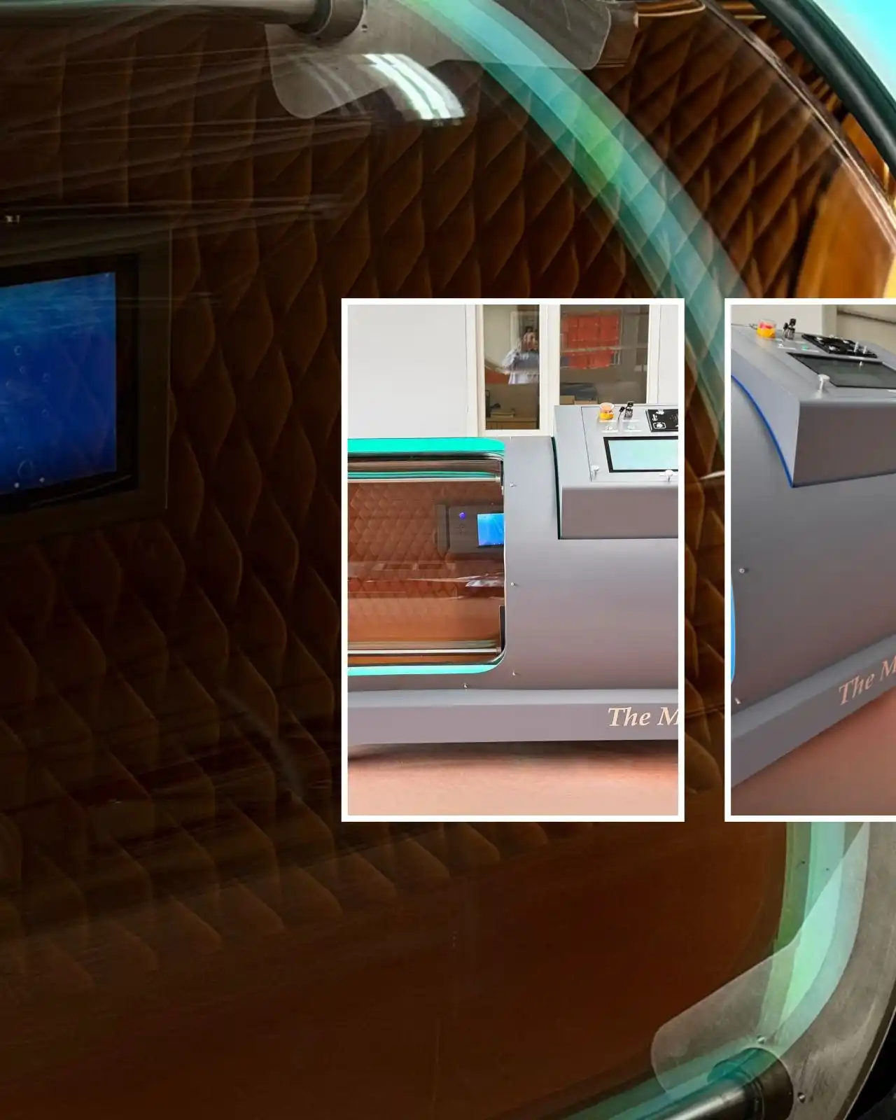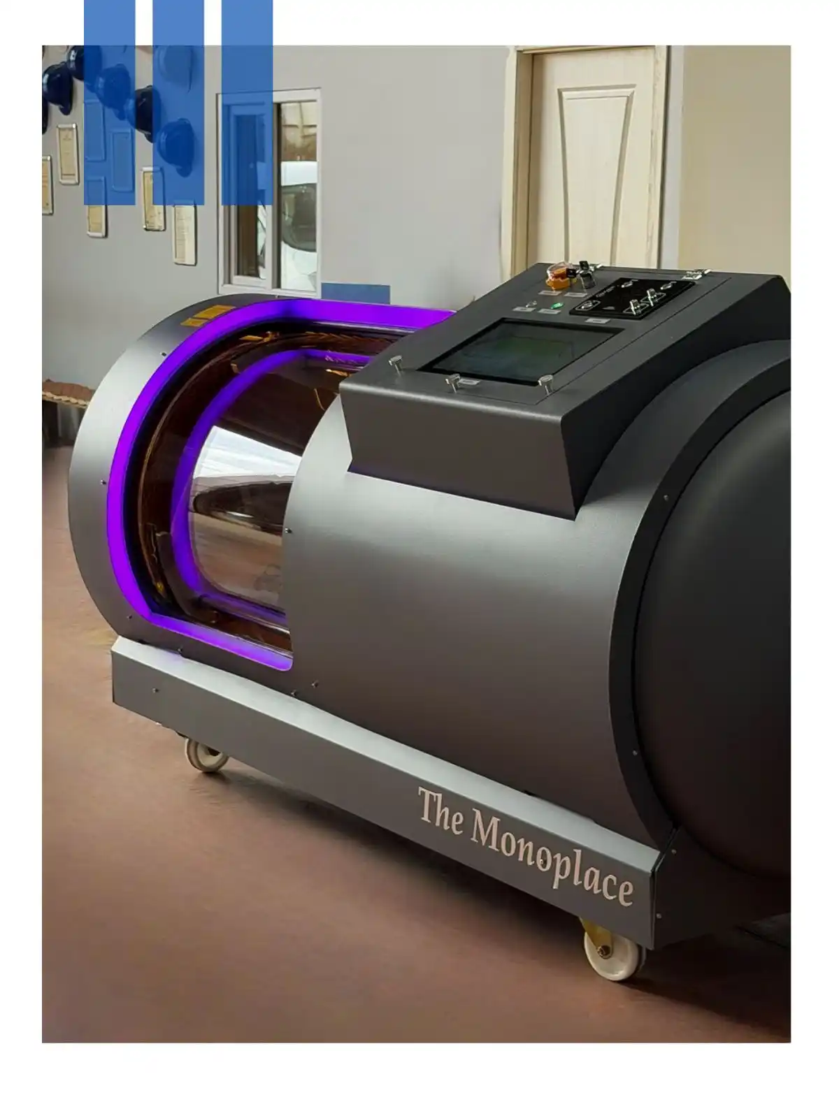 - Control Panel: Electronic tablet displaying the chamber data, oxygen concentrator and comrpessor data, Automatic pressurizing, Tablet mounted inside for patient (touchscreen), Led illumunation lights, Fire proof blanket. Oxygen analyzer.